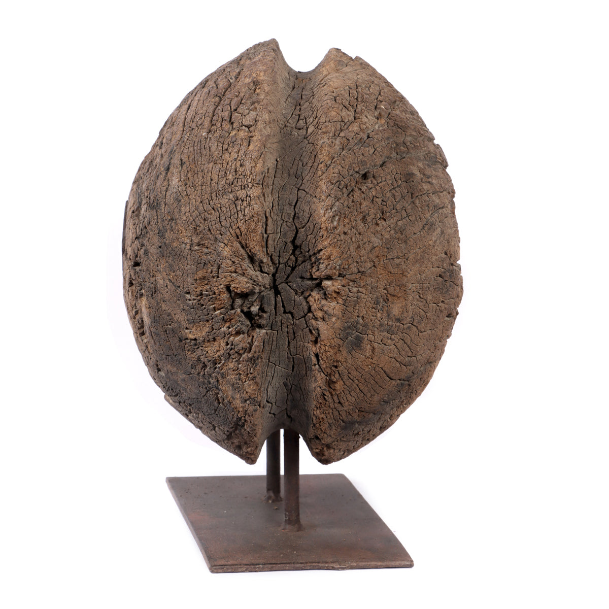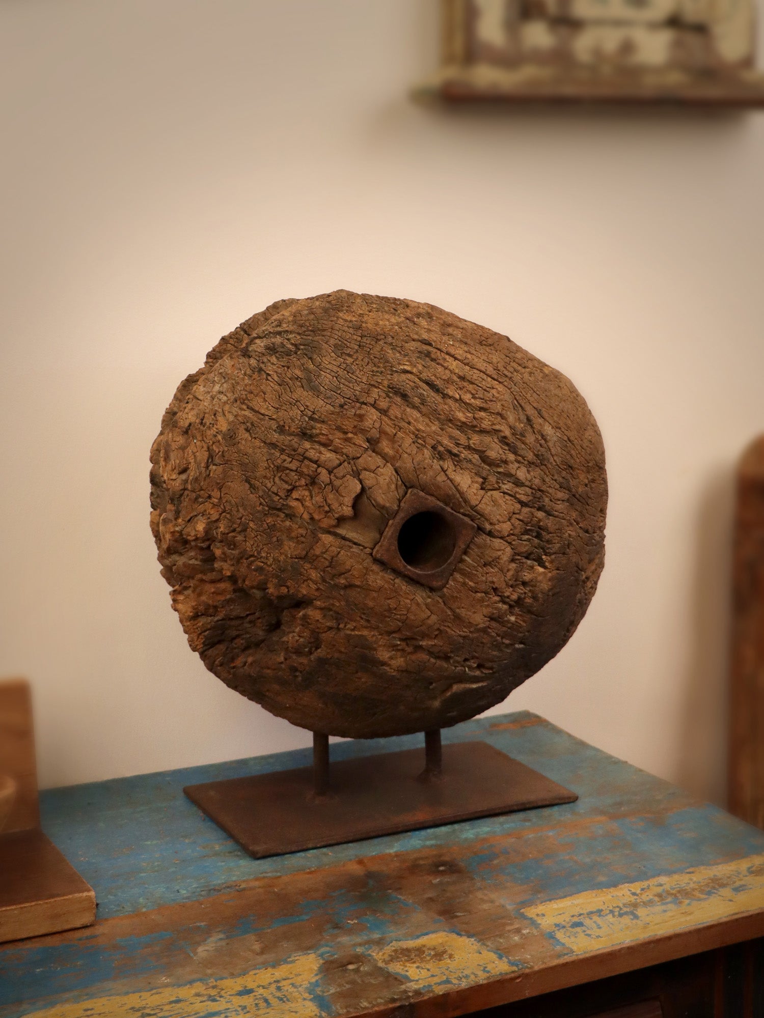 An original antique pulley wheel on a metal stand.This is a tremendous decorative piece with great wear and texture to the wood.The wheel has a deep groove in the centre,where it has been worn down by the pulley rope over many years of use.